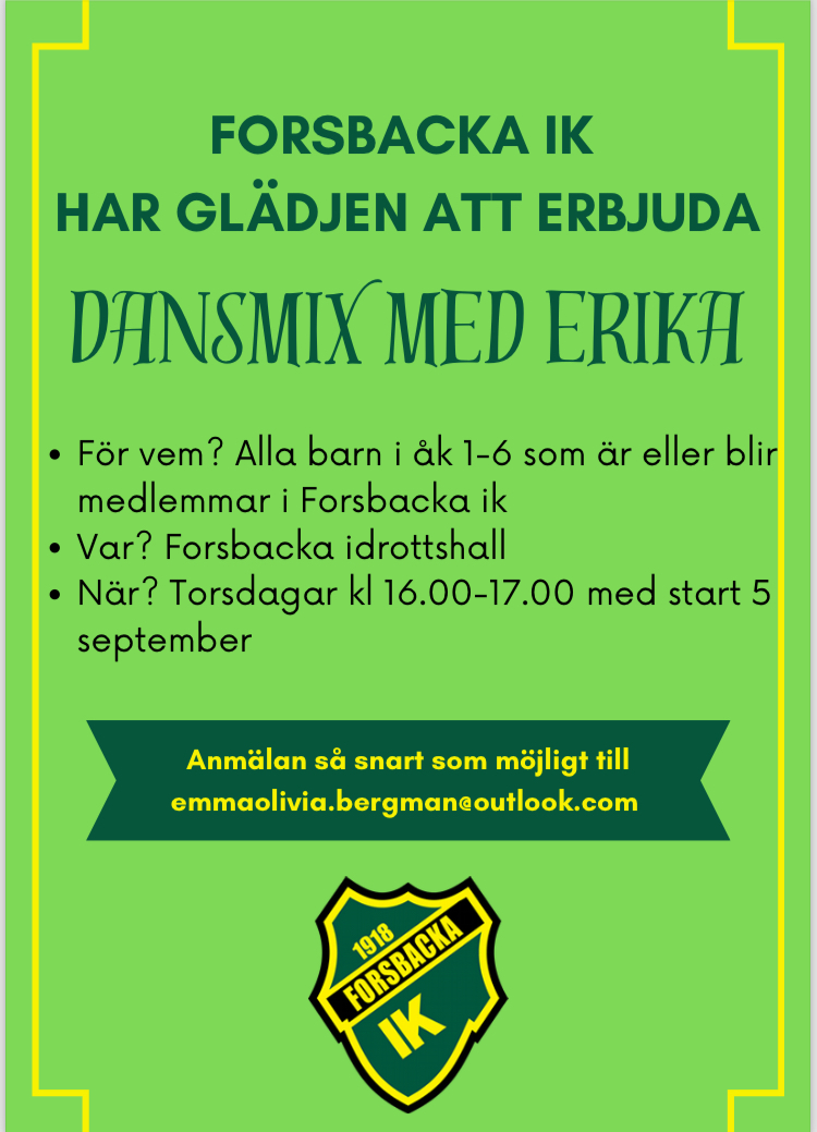 Vi kan med glädje berätta att vi kommer att erbjuda DANSMIX för barn i åk 1-6 med start nu på torsdag den 5 sept kl 16 i idrottshallen i Forsbacka!
