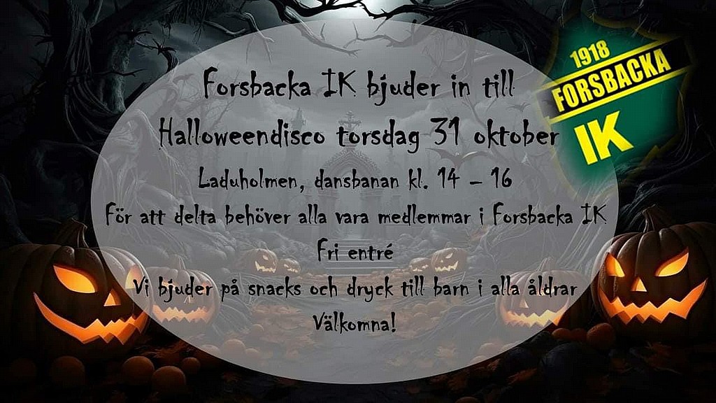 Välkommen på Halloweendisco! Forsbacka IK bjuder in till Halloweendisco torsdagen den 31 oktober kl 14-16