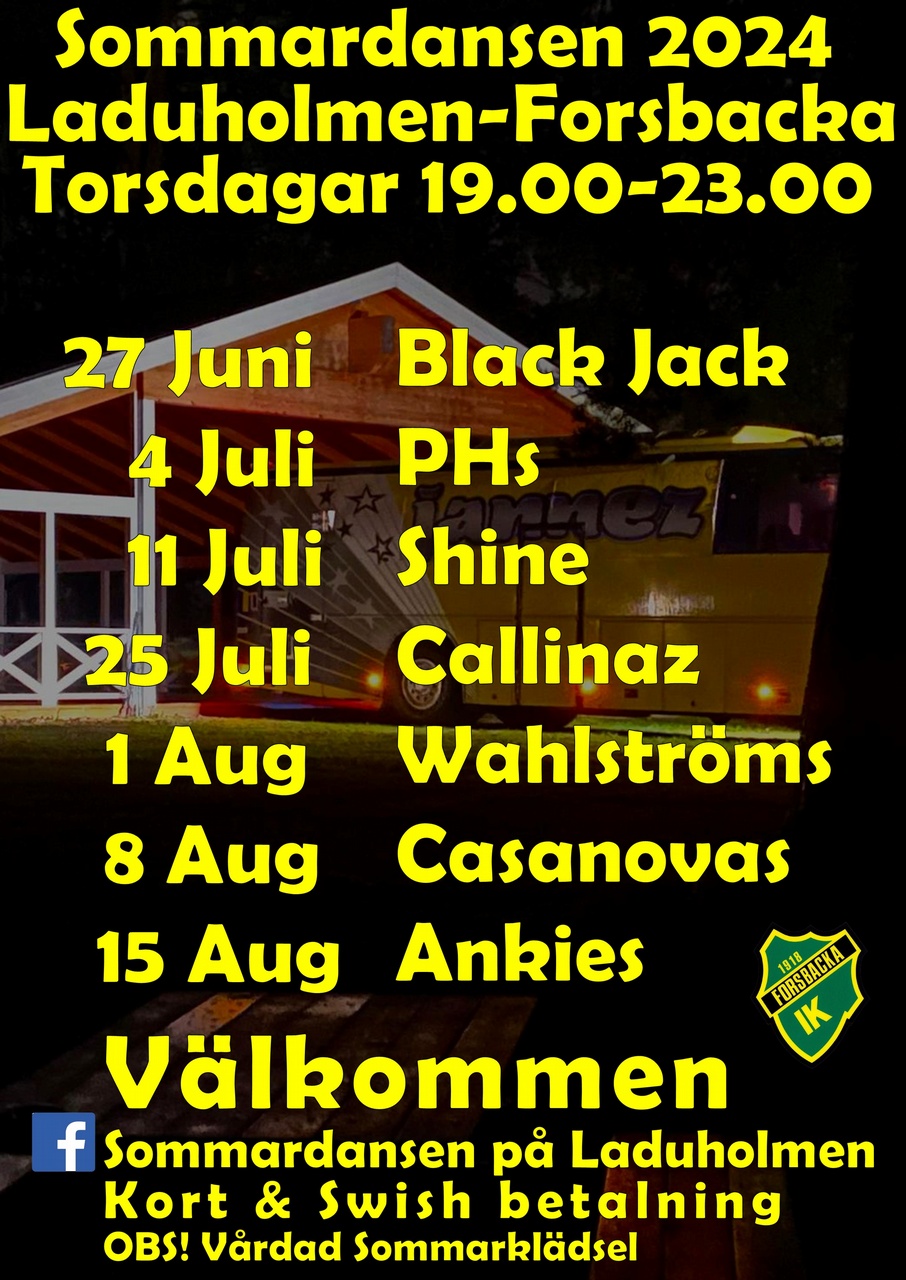 Välkomna till natursköna Laduholmen i Forsbacka, där vi sommaren 2024 arrangerar 7 torsdagsdanser.